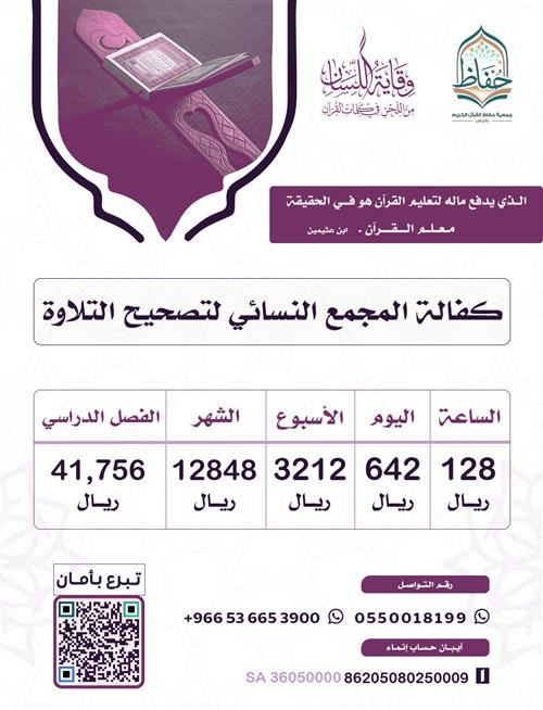 مشروع نسائي متخصص بتعليم وتصحيح تلاوة القرآن الكريم ، ويرجى لمن تكفل بتعليم الدارسة أجرها وأجر من ستعلمه ..